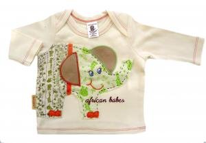 Ethically made in South Africa from 100% fair traded African cotton. Really cute long sleeve tee made in this lovely soft cotton jersey with a gorgeous elephant appliqued on the front with flappy ears. The neck line is envelope style making dressing and changing easy.