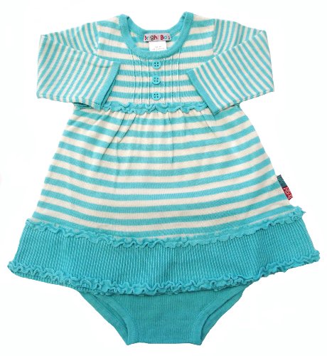 This adorable piece adds a modern twist to a traditional knitted dress. It has a beautiful full skirt, ruffled edges and delicate neckline details teamed with bright and bold stripes. It also has matching knitted bloomer to cover those nappies up in this pretty outfit.